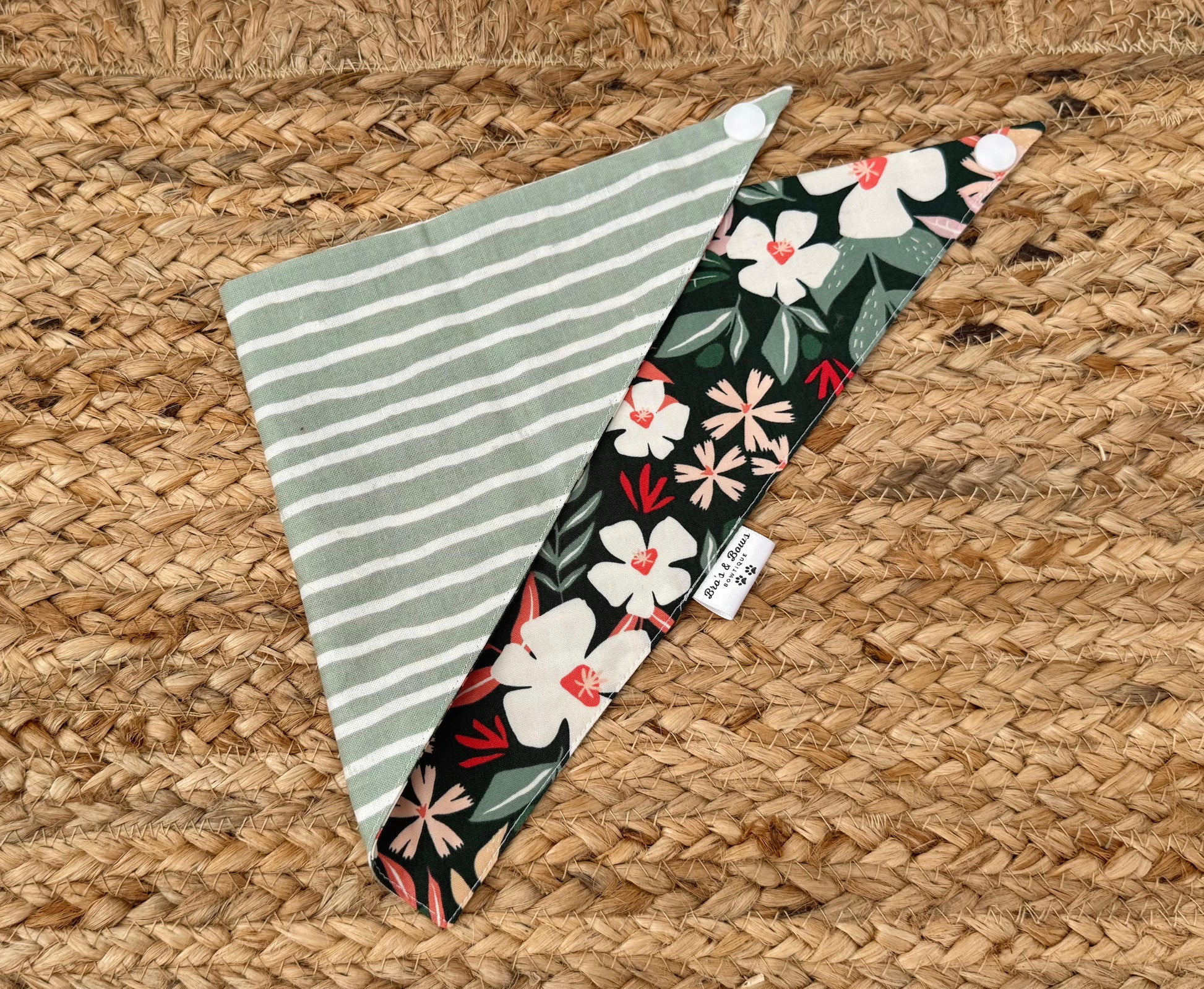 • Our bandanas have one snap on each end and are meant to be tied once (not a full knot) and then snapped together on the ends (shown in photos)